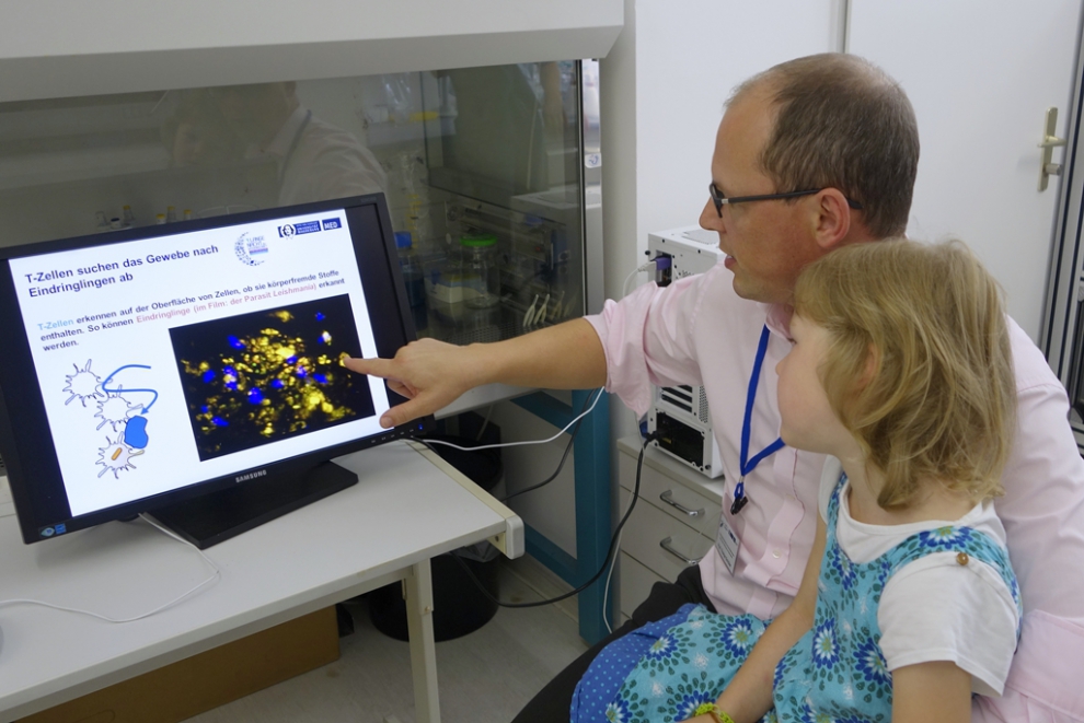 In celebration of the 60th Anniversary of University Medicine in Magdeburg, the many institutes and clinical departments opened their doors.  In the laboratories of the Institute of Molecular and Clinical Immunology, there was a lot going on.  The doctoral students of the MGK 854 worked hard to offer the many visitors an exciting program.
