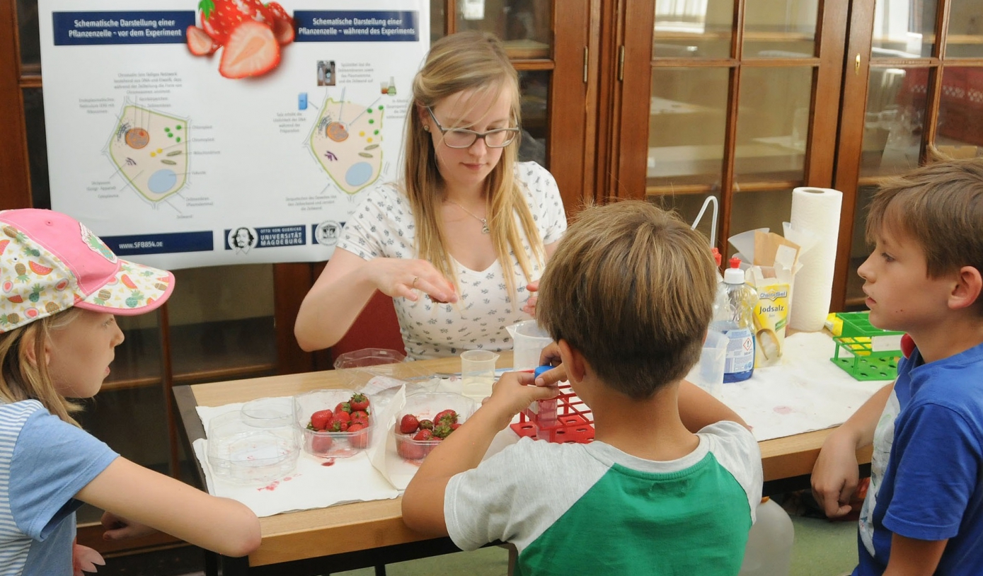 Impressions of the campus holiday for kids by the CRC 854. On July the 5th and 12th 2018, science-hungry young researchers discovered the world of immune cells. They had lots of fun competing in the immune cell quiz, making buttons, isolating DNA from strawberries and visiting a working research lab. PhD students and staff members of the SFB demonstrated the world of the immune system to the junior researchers. Additionally, all children could take home comics, audio books and cuddly toys by the dsai e.V.. These will hopefully encourage our visitors to learn more about the wonderful world of the immune system at home!