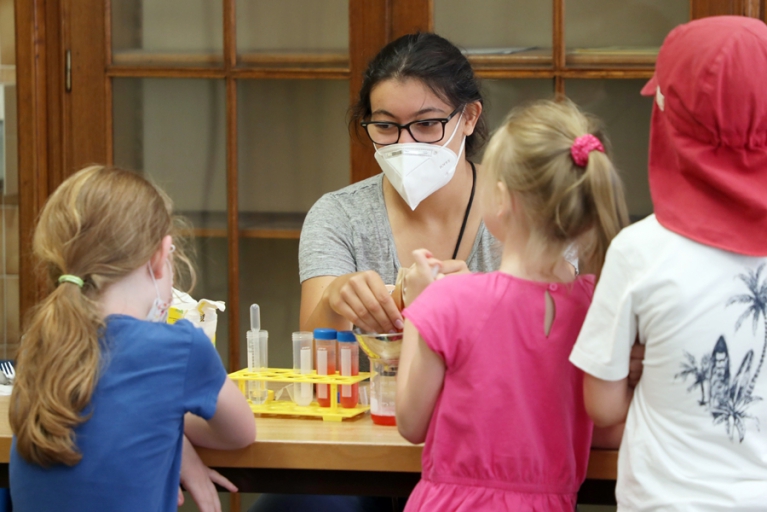 After an involuntary break in 2020 we could again welcome little scientists on the 29th of July and 5th of August. Within the framework of the campus holidays for kids of the family office of the OVGU they visited us, to discover the world of immune cells. PhD students of the MGK 854, students of the M.Sc. Immunology and staff members of CRC 854 gave them insights into the immune system. During an interactive lecture the children learned what this mysterious immune system actually is and how our body police protects us from intruders. Numerous questions and enthusiastic participation showed that the children had already heard many of the key words due to the pandemic but making sense of them is actually not so easy. Afterwards the litte discoverers could get gloves on and isolate DNA from strawberries - every succesful isolation was excitedly greeted. Furthermore the children could make immune cell buttons and take them home afterwards and everyone got a copy of "Immun im Cartoon", a comic for further reading at home. Thank you very much to the dsai e.V. (Patientenorganisation for angeborene Immundefekte) for providing these free of charge!
